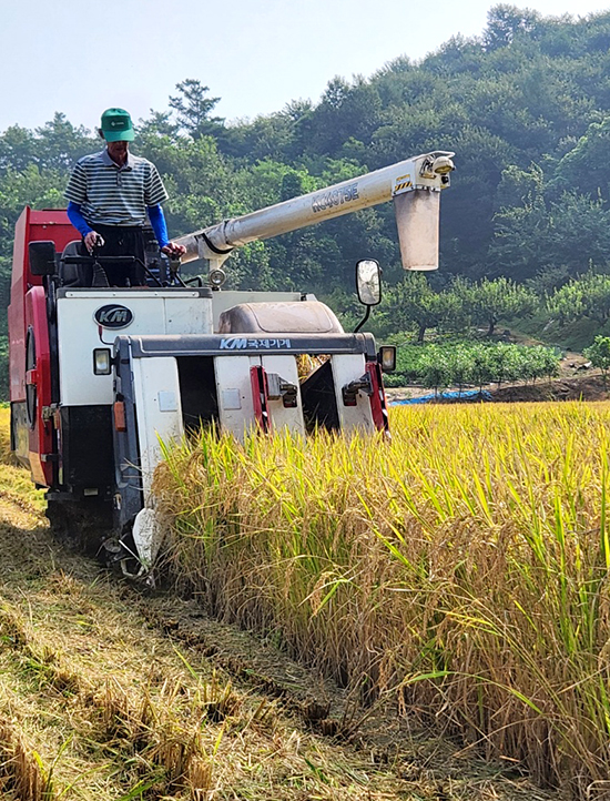 올해 첫 벼베기가 지난 25일 횡성읍 추동리에서 진행됐다. 이날 추동리 김복수 농가는 조생종 진옥벼를 수확해 횡성 8대명품 어사진미 브랜드 쌀로 판매할 예정이다.