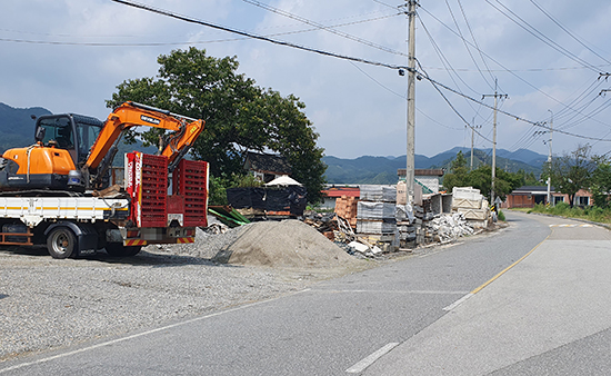불법으로 사용하는 필지는 지목이 전·답과 도로부지로 되어 있으나 각종 자재를 쌓아놓고 장비도 주차하고 있으며 한쪽에는 건설자재 잔여물까지 야적해 놓아 문제로 지적되고 있다.