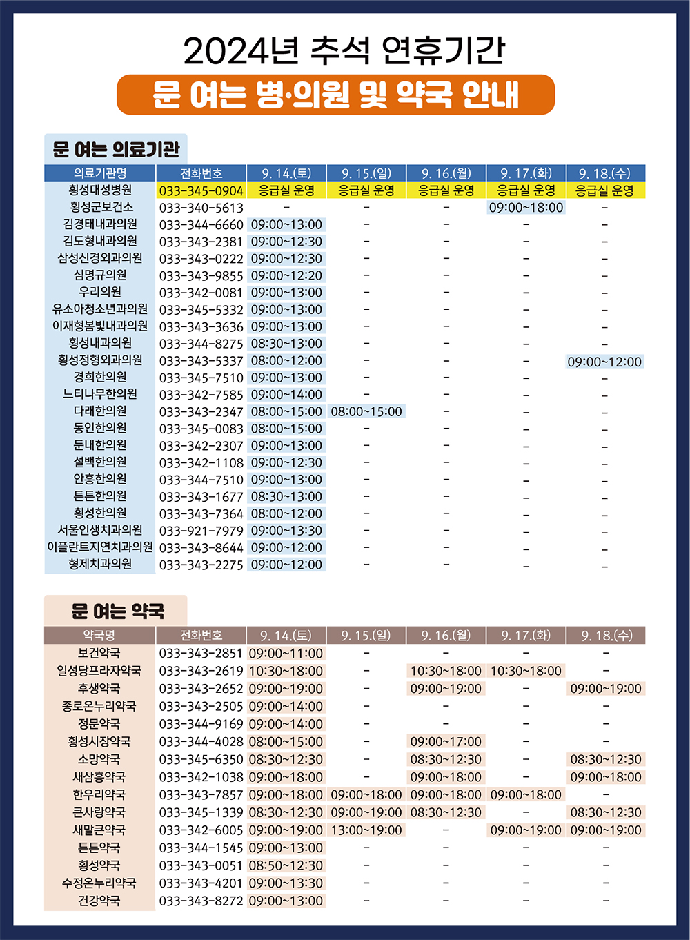 추석 연휴 기간 중 횡성에 머무는 지역주민과 귀성객들이 안전하고 편안한 명절을 보낼 수 있도록 9월 14일부터 9월 18일까지 5일동안 종합대책 상황반을 운영한다.