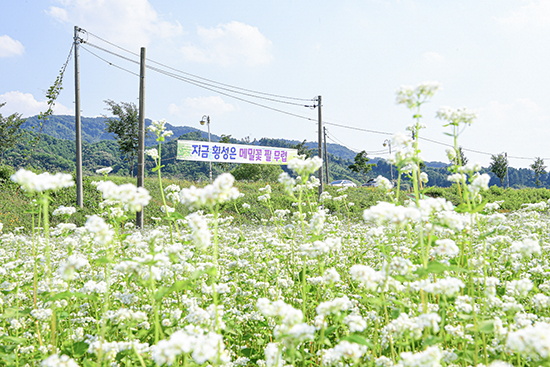 KTX횡성역 인근에 위치한 마산리 버덩말경관농업단지는 지난 8월 농가들의 구슬땀으로 파종한 씨앗이 현재는 메밀꽃으로 만개해 지나가는 방문객의 이목을 끌고 있다.
