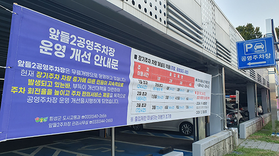 본지 보도 이후 횡성군은 뒤늦게 주차환경 개선을 위한 장기주차 차량에 대해 패널티를 적용하겠다는 대책을 내놓았고, 9월부터 시범운영을 거쳐 12월 정상운영하겠다고 운영 개선 안내 현수막을 게첨했다.