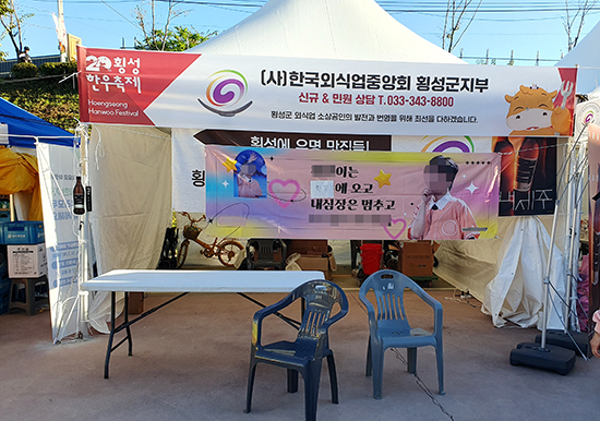 제20회 횡성한우축제장에 마련된 한국외식업중앙회 횡성군지부 위생·교육 상담부스에 트롯가수 현수막이 내결려 있다.