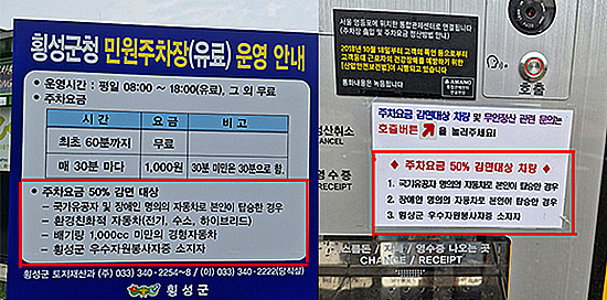 민원주차장의 운영 안내 표지판에는 ‘주차요금 50% 감면 대상’으로 국가유공자 및 장애인 자동차, 환경친화적 자동차(전기, 수소, 하이브리드), 배기량 1,000cc 미만의 경형자동차, 횡성군 우수자원봉사자증 소지자를 안내하고 있다.