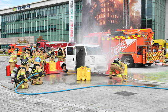 특히 실제 전기차 화재 발생을 연출해 특화장비인 이동식 수조로 화재진압을 시연해 보이는 등 토론과 현장훈련의 실시간 통합연계로 훈련의 내실을 더했다.