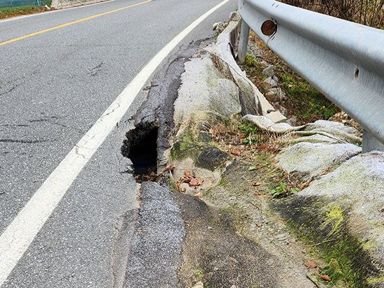 지난 장마철에 발생한 씽크홀과 무너진 아스팔트가 현재까지 보수가 안되어 이곳을 통행하는 주민들은 겨울철에 눈이 오면 미끄럼 사고로 인한 교통사고에 불안을 호소하고 있다.