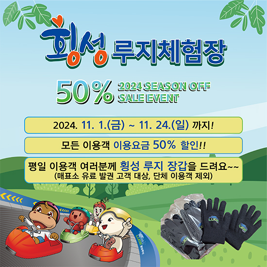 현장 발권자는 정상가의 50%, 온라인 구매자는 55%의 할인을 받을 수 있다. 또한 해당 기간 동안 평일 매표소 유료 발권 고객을 대상으로(단체 이용객 제외) 선착순으로 횡성루지 장갑을 증정한다.