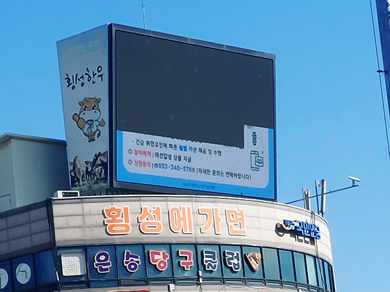 횡성오거리 인근 건물에 설치된 전광판은 횡성 8대 명품을 비롯한 주요 관광지, 전통시장, 보건 안전 및 축제 등 다양한 군정 홍보를 하고 있다.