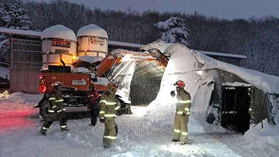 횡성소방서에 따르면 지난 28일 오전 5시 1분께 둔내면 현천리에서 쌓인 눈의 무게를 이기지 못하고 축사가 무너졌다. 젖소 36마리 중 32마리를 구조했다.