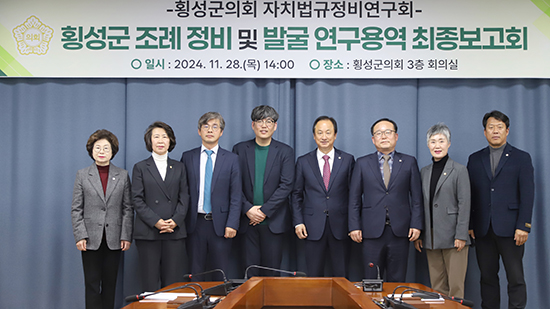 | 횡성군의회(의장 표한상) 의원연구단체인 횡성군의회 자치법규정비연구회는 지난 28일 조례 정비 용역 최종보고회를 열고 결과를 공유했다.