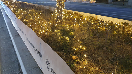 | ↑↑ 차단막(바람막이) 설치로 가로수 하단부에 화려한 조명이 가려져 제구실을 못하고 있다. |