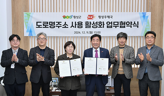 | 횡성군과 횡성우체국은 지난 9일 오후 횡성군청에서 김명기 군수와 김효민 횡성우체국 총괄국장이 참석한 가운데 도로명 주소 활성화를 위한 업무협약을 맺었다.