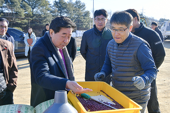 | 전국으로 보급되는 정부보급종 팥(품종 아라리) 종자 수매가 지난 19일 공근면 매곡리 일원에서 종자 생산 농가가 참석한 가운데 실시했다.