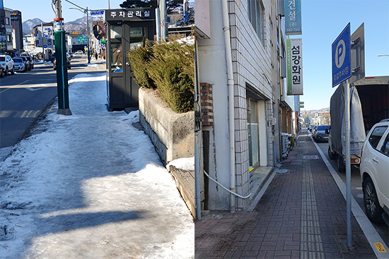 | ↑↑ 사진은 군청 주차장 앞 인도(좌측), 건너편 점포 앞 인도(우측) |