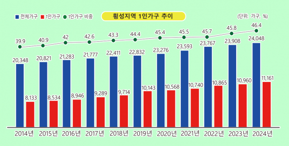 횡성군 인구현황에 따르면 2024년 12월 말 기준 세대원수는 2만4,048가구로 집계됐다. 이중 1인 가구는 1만1,161세대로 전체의 46.4%를 차지하고 있다. 이어 2인 31.8%(7649세대) 3인 11.8%(2849세대) 4인 6.5%(1585세대) 5인이상 3.3%(804세대) 등의 구성비를 보였다.