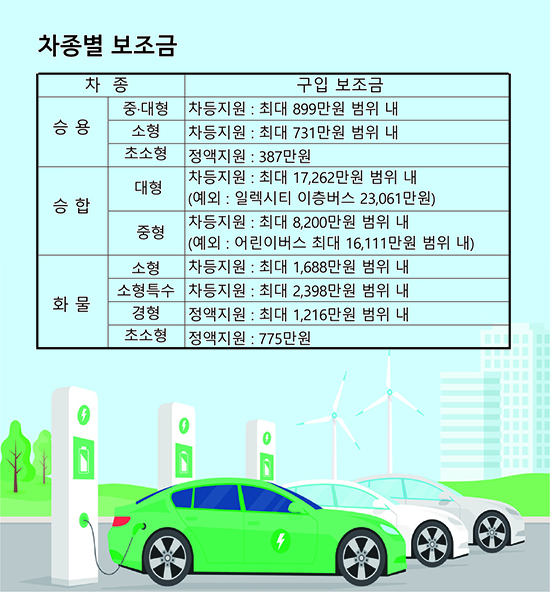 보조금 기준 단가는 전기자동차의 경우 승용차가 최대 588만 원, 화물차는 최대 1,635만 원, 승합차는 최대 2억700만 원이다. 수소전기자동차의 경우 승용차는 3,450만 원이다. 추가보조금으로는 택시 국비 250만 원, 차종에 따라 차상위 이하 계층 구매 시 국비 20%, 다자녀가구 구매 시 2자녀 100만 원, 3자녀 200만 원, 4자녀 이상 300만 원 등이 지원된다.