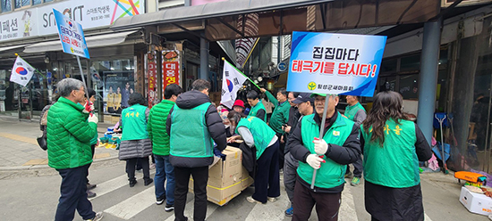 횡성군새마을회(회장 신형철), 새마을지도자횡성군협의회(회장 김진완), 횡성군새마을부녀회(회장 백향옥), 새마을문고횡성군지부(회장 김재동)은 지난 1일 횡성시장 일원에서 주민들에게 3·1절 나라사랑 태극기 달기 캠페인을 회원 30여 명과 함께 진행했다.