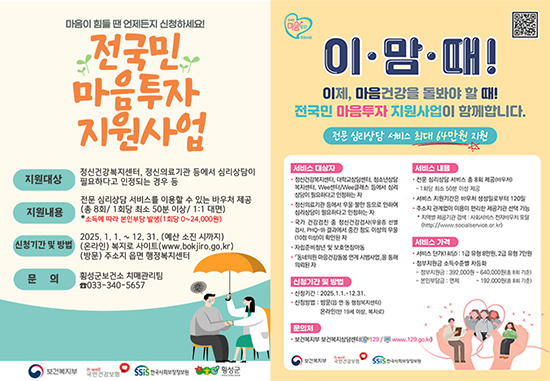 ‘전국민 마음투자 지원사업’은 우울·불안 등 정서적 어려움을 겪는 주민들에게 전문 심리상담 서비스를 제공하며 120일간 총 8회 서비스 이용이 가능하다.