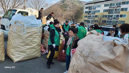 둔내면 새마을부녀회(회장 박영자)는 지난 19일 오전 복지회관 앞 마당에서 부녀회원과 새마을지도자 회원 등 50여 명이 24개리에서 수거한 페트병과 헌옷을 정리했다.