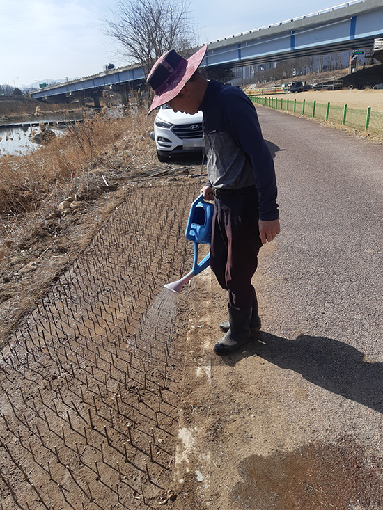 전천교 강변 파크골프장 인근에서 ‘플라밍고 셀릭스’ 800그루를 심고 물을 주고 있는 80세를 앞둔어르신이 있다. 모두 ‘재능기부’ 할 것이라고 했다.