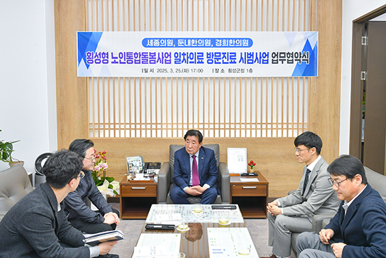 | 횡성군이 노인 의료돌봄 통합지원 강화를 위해 지난 25일 오후 군청 접견실에서 세종의원(원장 박찬규, 횡성읍), 둔내한의원(원장 이용, 둔내면), 경희한의원(원장 이승기, 횡성읍) 3개 의원급 의료기관과 ‘일차의료기관 방문진료 시범사업’ 업무 협약을 맺었다.