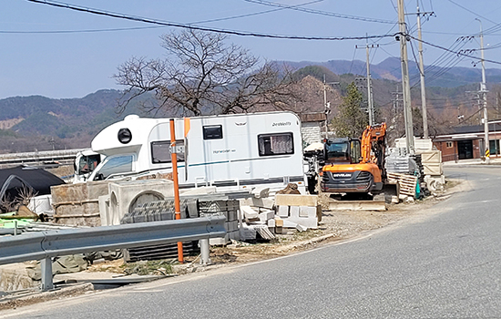 횡성읍 마옥리 마을 입구 대로변에 아무런 허가 없이 불법으로 건축자재를 야적하고 각종 장비를 세워두고 있어 도로 미관과 마을 분위기를 해치고 있어 불법 사항에 대한 처리가 시급하다.