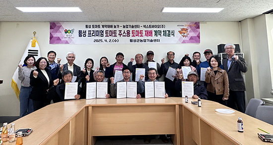 | 횡성군농업기술센터(소장 임종완)는 특산자원융복합 사업 일환으로 농업기술센터와 우천 제2농공단지 소재 ㈜넥스트바이오, 토마토 재배 농가 등이 참석한 가운데 ‘비가열 프리미엄 토마토 주스 생산을 위한 토마토 계약재배 계약’을 위한 협약식을 체결했다.
