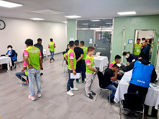 | ↑↑ ▲올해 1,336명(라오스 729명, 필리핀 405명, 결혼이민자 가족 초청 202명)의 외국인 계절근로자가 들어와 325개 농가에 배치될 예정이다. 사진은 마약검사와 신체검사를 받고 있다. |