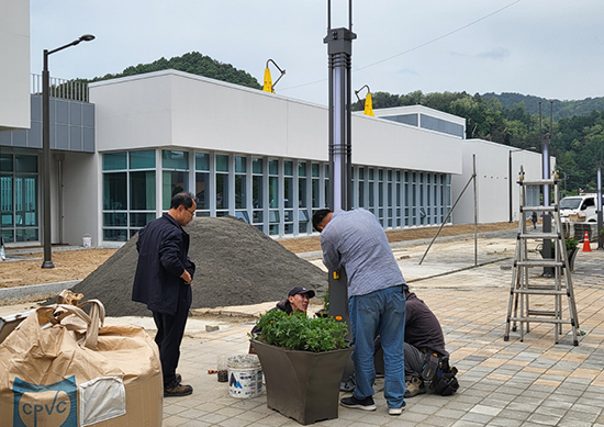 당초에 올 3월까지 완공 예정이었으나 5월 하순 현재 화단과 조명, 진입로 등 외부 공사에 분주한 모습을 볼 수 있다.