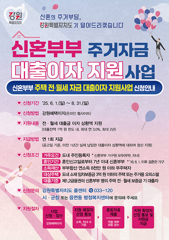 | 횡성군은 결혼 초기 주거비 부담을 덜고 안정적인 가족 형성을 돕기 위해 오는 8월 31일까지 ‘신혼부부 주거자금 대출이자 지원사업’ 신청을 접수한다.
