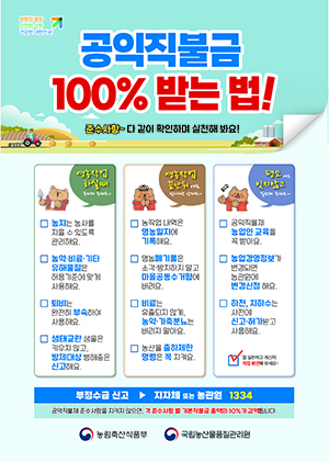 기본형 공익직불제는 농업·농촌의 공익적 기능을 증진하면서 농업에 종사하는 농업인의 소득안정을 위해 직불금을 지원하는 제도로, 직불금을 100% 받기 위해서는 법령에서 정한 16가지 준수사항을 모두 실천해야 한다.