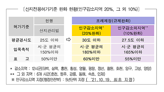 평균 경사도는 인구감소지역은 기존 25도 이하에서 30도 이하 인구감소 외 지역은 27.5도 이하로 완화되고 산림 내 나무 부피를 나타내는 입목축적기준은 시군 평균의 150% 이하에서 인구감소지역 180% 이하, 감소 외 지역은 165% 이하로 완화된다.