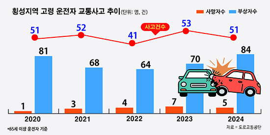 2020년 51건, 2021년 52건, 2022년 41건, 2023년 53건, 2024년 51건으로 매년 평균 50건이 발생하고 있으며 지난해의 경우 연령별로 보면 65∼69세 21건, 70∼74세 16건, 75∼79세 9건, 80세 이상 5건으로 사망 5명, 부상 84명으로 분석됐다.