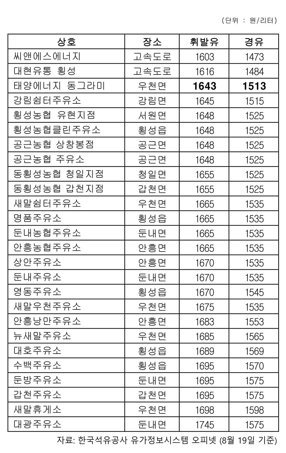 횡성지역 26곳의 주유소 중 고속도로 주유소를 제외하고 기름값이 가장 싼 주유소는 태양에너지 동그라미주유소(우천면)가 휘발유와 경유가 각각 리터당 1,643원과 1,513원에 판매해 가장 저렴했다.