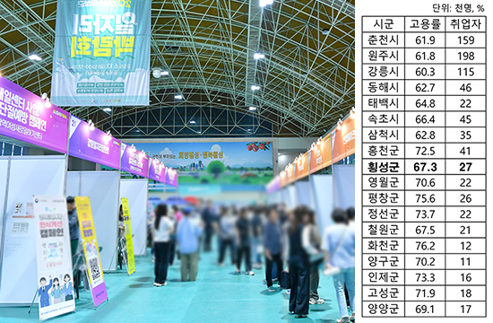 통계청이 반기마다 발표하는 ‘2025년 상반기 지역별고용조사’에 따르면 올해 상반기 횡성군 고용률은 67.3%로, 강원도 평균 66.7%보다 높고, 11개 군(郡) 평균 71.5%보다 낮은 수준으로 도내 군(郡) 단위에서는 꼴찌다.