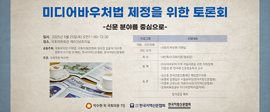 이날 토론회는 박수현 의원이 좌장을 맡아 진행되며 지역신문발전위원회 위원으로 지역언론에 대한 이해가 깊은 이용성 전 한서대 신문방송학과 교수가 ‘미디어바우처: 지역저널리즘을 위한 지원정책’ 이란 주제발표를 하고 김선호 한국언론진흥재단 책임연구위원, 유병욱 강원일보 서울본부장, 이영호 군포신문 대표이사가 토론자로 참석해 미디어바우처법 제정을 위한 구체적 방안에 대해 열띤 토론을 펼칠 예정이다. 문화체육관광부 미디어정책국은 옵저버로 참여한다.