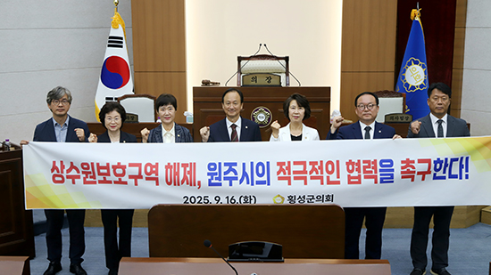 | 횡성군의회(의장 표한상)는 지난 16일 제2차 본회의를 개의하고 횡성군 최대 현안인 상수원보호구역 해제를 위한 원주시의 적극적인 협력을 촉구하는 성명서를 채택했다.