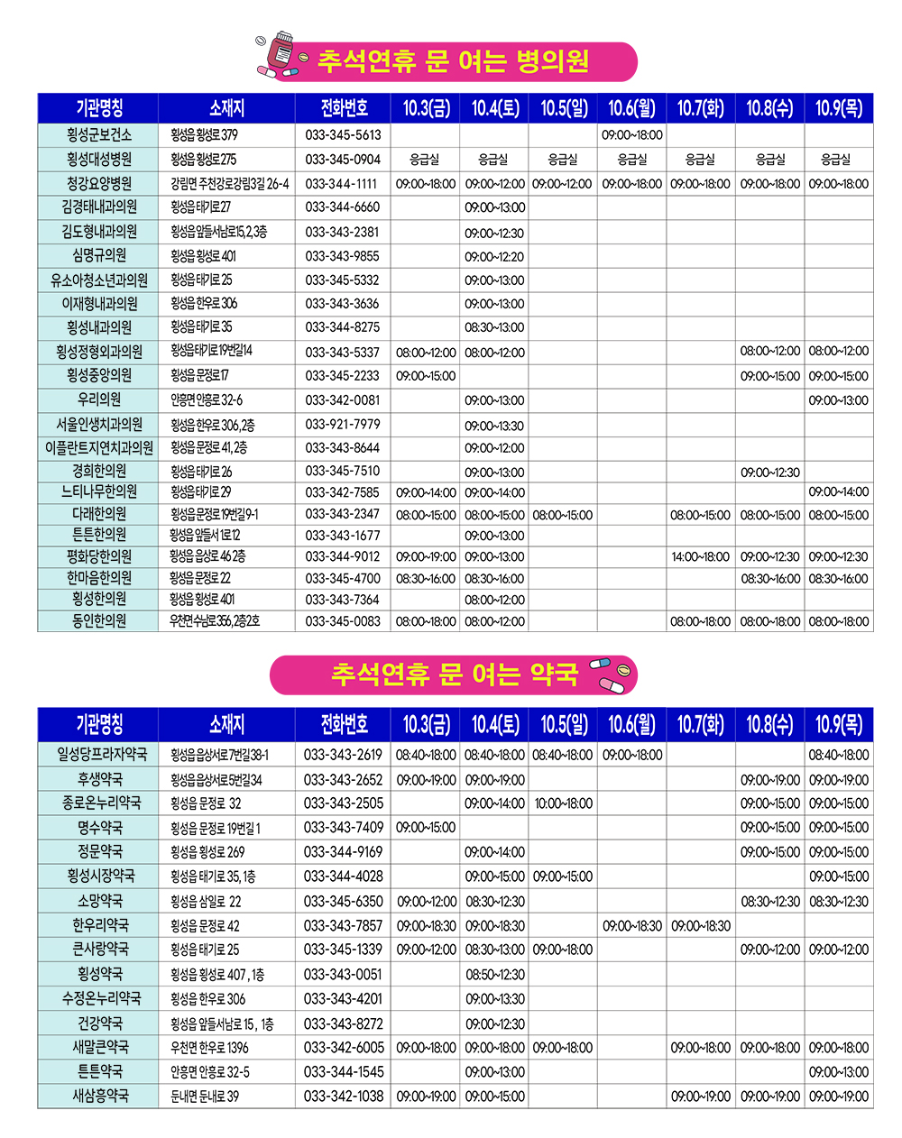 | 추석 연휴 기간 중 횡성에 머무는 지역 주민과 귀성객들이 안전하고 편안한 명절을 보낼 수 있도록 10월 3일부터 9일까지 7일 동안 종합대책 상황반을 운영한다.