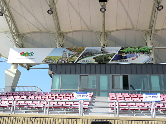 | ↑↑ ▲ 전국에서 체육인들이 많이 방문하는 횡성종합운동장에 횡성 8대 명품을 홍보하는 대형 간판과 그 옆에는 풍수원성당, 호수길, 루지체험장을 홍보하는 간판이 내걸려 있다. |