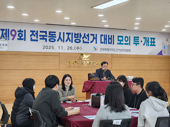 ↑↑ 도선관위, 내년 지방선거 대비 모의 투·개표 내년 6월 3일 실시되는 제9회 전국동시지방선거를 앞두고 강원특별자치도선거관리위원회가 지난 26일 실제 선거와 같은 절차대로 모의 투·개표 실습을 진행했다. 이번 모의 투·개표는 투·개표 사무원, 선거인, 참관인 등으로 역할을 분담해 실습함으로써 실무능력 강화와 내년 지방선거의 완벽한 준비를 위해 실시됐다. |