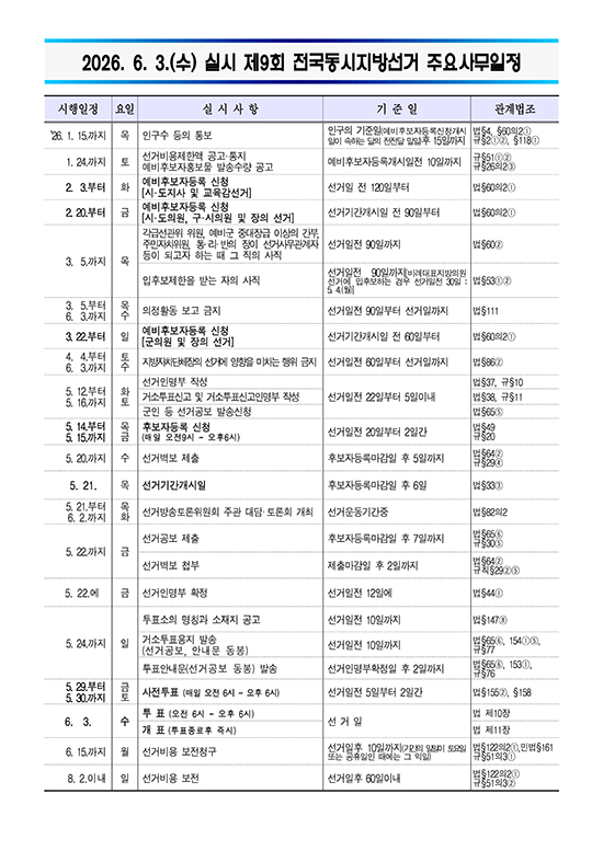 | 2026년 6월 3일 실시 예정인 제9회 전국동시지방선거를 앞두고 선거일 전 180일인 12월 5일부터 지방자치단체장 및 정당·후보자가 설립·운영하는 단체의 활동이 제한된다.