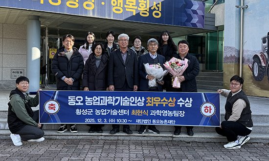 | 횡성군농업기술센터 최현식 과학영농팀장이 지난 3일 ‘2025년 동오 농업과학기술인상(기술 부문)’에서 최우수상을 수상했다.
