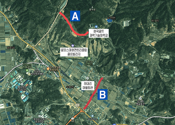 반대 이유에 대해 마을회 신모 이장은 “군에서 신설하려는 도로(이하 A 도로, 약 1.2㎞)는 우리 주민들 입장에서 보면 그리 급한 도로도 아니고 거주 주민도 거의 없다”며 “우리의 숙원 도로는 새말 IC에서 골프대학 진입로에 직선으로 연결되는 도로(이하 B 도로, 약 1.5㎞)이다”고 말했다.