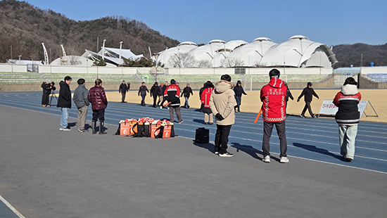 | ↑↑ ▲ 지난 20일 한파경보가 내려진 가운데 추운날씨 속에서도 오전10시(체감온도 영하 10도)부터 횡성종합운동장 트랙에서 2026년 산불감시원 및 산림재난대응단 선발을 위한 체력검정이 실시됐다. |