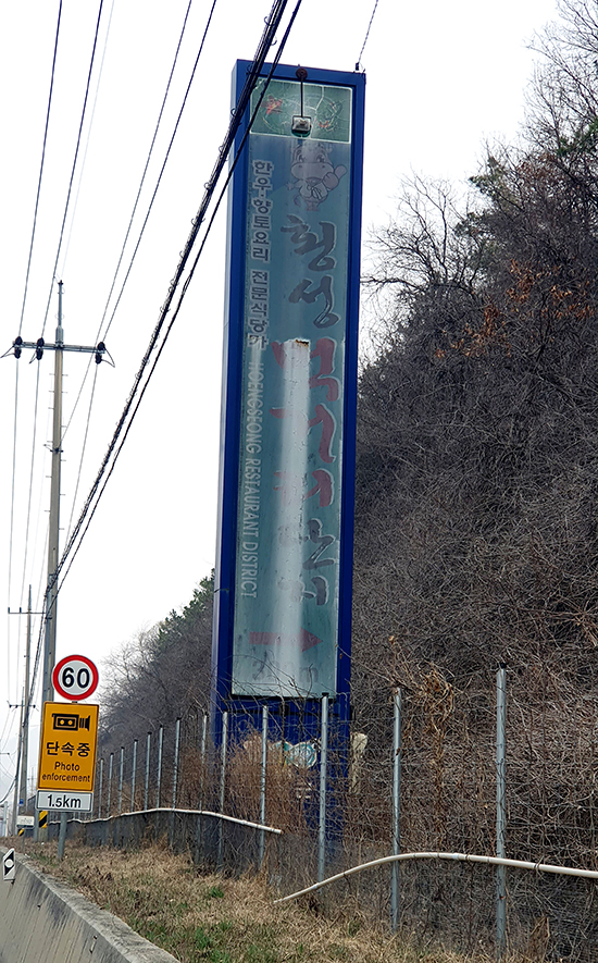 | ↑↑ ▲ 원주(횡성)공항 부근 도로에 설치된 횡성먹거리단지를 알리는 간판이 형태를 알아볼 수 없도록 변해져 있다. |